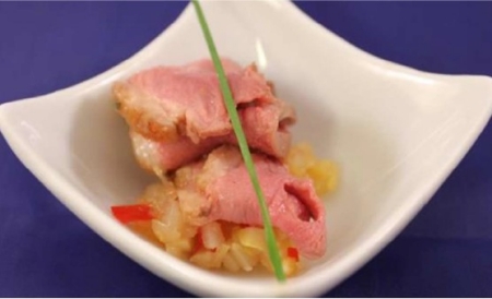 Snijd voor de amuse de eendenborst in dunne plakjes.