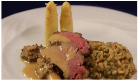 Zet 2 aspergepunten rechtop op het bord. Leg 4 gebakken stukken asperge als een waaier op het bord. Schep een quenelle risotto in de waaier. Leg er 2 plakken vlees bij en nappeer de saus er op en omheen.