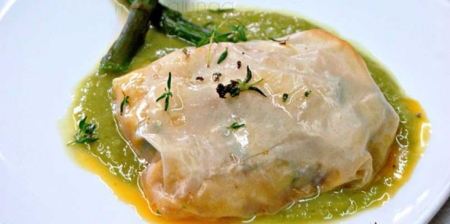 Serveer de asperge strudels met de warme aspergesaus en garneer met peterselie.