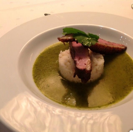 Verwarm de oven voor op 250°C. Zet de eendenborstfilets ongeveer 8 minuten in de oven. Daarna moet de eendenborst nog 10 minuten rusten. Plaats met behulp van een opmaakring een ruime hoeveelheid Limoen risottini in het midden van het diep bord. Warm de curry op, giet deze er omheen. Leg de geroosterde eend in 2 lengte plakken op de curry en risottini. Garneer het gerecht met enkele blaadjes koriander.