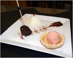 Zet een streep chocolade op het bord. Aan het einde van de streep de lolly. Haal de panna cotta uit vorm zet deze op het bord. Zet de tuille op het bord en daarin een bolletje bloedsinaasappel ijs.