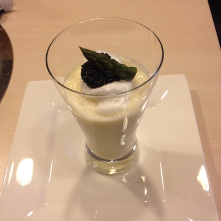 De room bij de koude soep doen en deze in diepe borden gieten. De groene aspergepunten toevoegen. Het eiwitschuim op de soep leggen en een klein lepeltje nepkaviaar schikken.