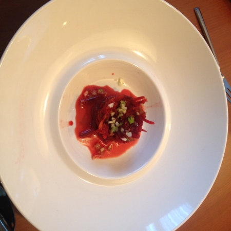 De helft van de rode biet gaar koken. De overblijvende helft en daarna ook de komkommer schillen. De rauwe biet, de gekookte biet en de komkommer malen in de machine (cutteren). De uitjes versnipperen. De groente tartaar kruiden met lente-ui, azijn, suiker, olie, peper en zout.