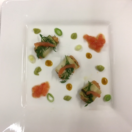Leg op elke cannelloni een toefje dille en een julienne van tomaat. Plaats een lente uitje.