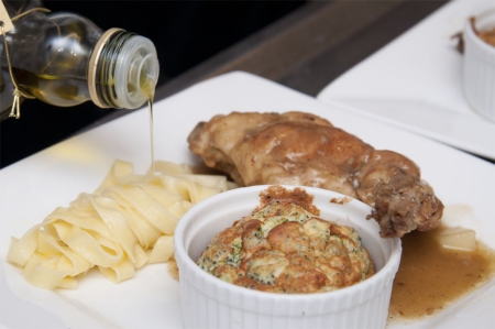 Leg een konijnbout op de tagliatelle, met de poot omhoog en schenk