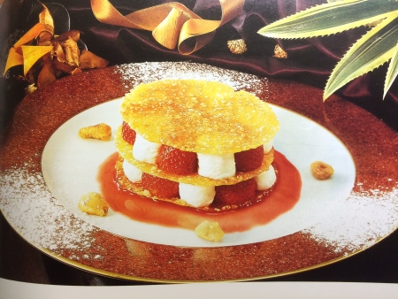 Schep wat saus op een bord, spuit de amandel crème met een spuitzak op de wafels en beleg met aardbeien. Maak op deze manier twee lagen. Garneer met de gekarameliseerde amandelen.