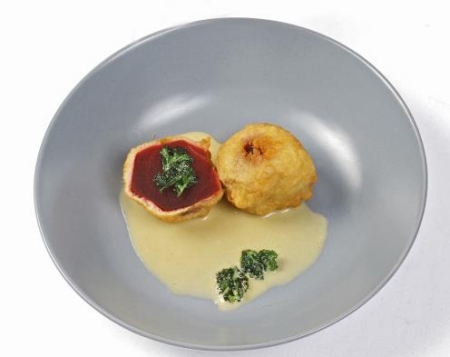 Verhit in een frituur pan olie tot 160 ºC, wentel de rode bieten volledig door de bloem en het frituurbeslag en frituur ze 1 à 2 minuten. Haal de rode bietbeignets met een schuimspaan uit de pan en laat ze uitlekken op keukenpapier. Frituur losse peterselieblaadjes voor de versiering. Giet de mierikswortelsaus op de borden, schik er de rode bieten in hun jasje op en garneer met de gefrituurde peterselie.