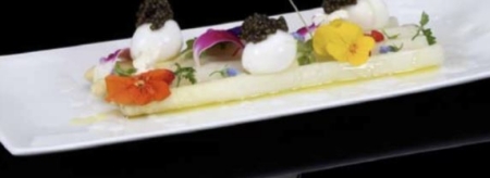 Dresseer de warme asperges op een rechthoekig bord,leg hierop drie de kwarteleitjes en doe op de eitjes de kaviaar. Garneer het geheel met de bloemtjes en de blossom .