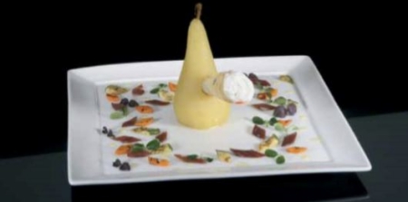 Zet de peer met de koker midden op het bord. Dresseer de stukjes courgette, winterpeen en ham om de peer. Garneer het gerecht met de Tahoon Cress en eventueel wat mooie olijfolie.