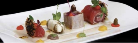 Maak een veeg tonijnmayonaise over de linkerzijde van het bord en trek deze met een spatel over het bord naar rechts. Snijd de gebakken tonijnmoot in delen van 2,5 cm en geef deze een drup Grand Cru olijfolie op de bovenzijde, gevolgd door een draai peper en wat Maldon zout. Plaats deze op het bord, links van het midden. Leg aan de rechterzijde van het tonijnmootje een deel van het rolletje tonijn/kalfsmuis, smeer op het laatste moment in met wat Grand Cru. Plaats aan de andere kant van het mootje het bokkenpootje. Leg aan de linkerzijde een mooie canelle van tonijntartaar. Versier het gerecht naar eigen inzicht met gele en rode paprika stippen. Plak de kletskoeken met behulp van de olijvencrème tegen het rolletje en de tartaar. Voeg wat stipjes olijvencrème toe aan het gerecht. Leg de gevulde olijven op de stipjes olijvencrème, op de tonijnmoot en naast de tartaar. Versier het gerecht met Persinette Cress en Scarlet Cress. Napeer wat dressing over het bord.