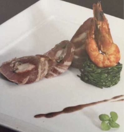 Snij de lamsfilets in de lengte net niet door. Leg de gebakken garnalen met de Shiso Purple in het midden van de lamfilets en rol deze strak op met het ontbijtspek. Bak de lamfilets aan in de olijfolie, verder rosé laten garen in de oven.