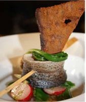 Dresseer de borden met elk gelijke delen van de salade en zet hierboven op de rolmops van forel. Besprenkel dit met de overgebleven dressing en steek tussen de rolmops de chips van kruidkoek.
