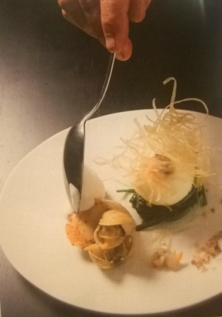Dresseer de zeeweegbree met behulp van een ring op het bord, leg er het ei op en dresseer de kokkels en de jakobsmossel bij. Nappeer met de emulsie en kruid het geheel met rookzout.