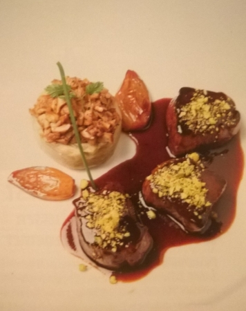 Laat even rusten en serveer met de rest van de onderdelen, nappeer rijkelijk met saus en garneer met gehakte pistache noten.