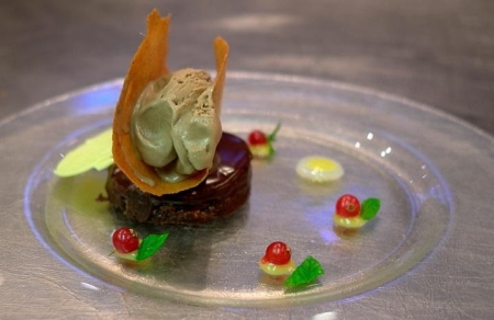 Plaats een chocoladegebakje op een bord. Steek kleine rondjes Gin gelei en leg deze er naast. Spuit de passievruchtenroom in een mooi patroon op de borden. Garneer de passievruchtenroom met een enkele rode bessen. Leg een tuile op elk gebakje en schep er een bolletje chocolade-notenijs naast.