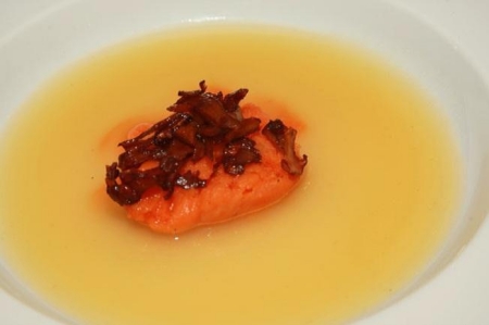 Giet 1 lepel soep in het bord. Plaats in het midden van het bord een bol sorbetijs en plaats hierop een cantharel-kletskopje.