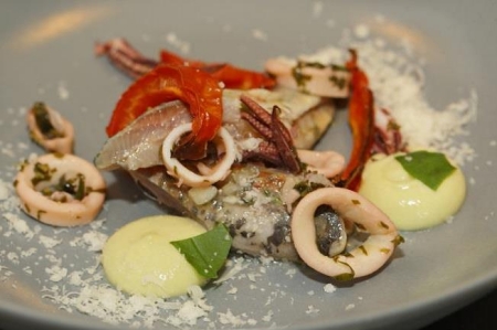 Maak een mooie compositie van de gedroogde tomaten, de inktvis en de geitenkaas in een diep bord. Leg daar de sardinesnoepjes op en spuit enkele grote druppels van de artisjokkenmousse rond de compositie. Besprenkel het geheel met een mooie olijfolie naar keuze. Serveer direct