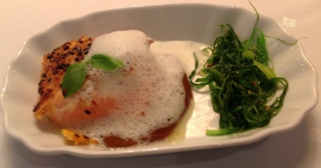 Maak het bord op met wakame, sechuan cress en mango/bonenpasta. Bak de zalm op een middelhoog vuur op de korstkant, op papier let op dat het niet verbrand. Wacht tot de zalm voor ¼ is gegaard, en zet het dan weg in de warmhoudkast. Laat in de pan staan. De zalm moet lauwwarm worden en niet verder garen. Mix het wasabi mengsel met de staafmixer luchtig op. Het beste kan je de pan een beetje schuin houden en de staafmixer tegen de rand aan half in de saus te laten hangen. Mocht hij niet luchtig worden kan je nog een beetje lecite er aan toevoegen. Plaats de zalm op het bord met de korstkant naar boven en werk af met de wasabi wolk.
