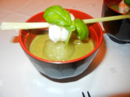 Sauteer de langoustines. Verpak elke langoustine in een basilicumblad. Steek er een citroengrasstengel doorheen. Doe de basilicumsorbet in de kommen. Leg hierop een langoustine en giet de gazpacho erbij.