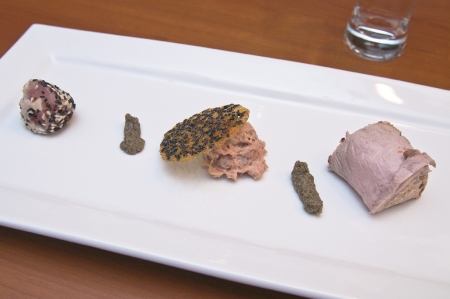 Leg hiernaast de tonijn en het kalfsrolletje. Bestrooi met wat fleur de sel.