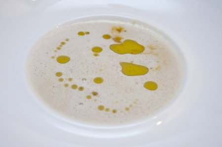 Verdeel de sinaasappeluitjes over voorverwarmde diepe borden. Schenk de crémeuse rondom en druppel er salieolie in.