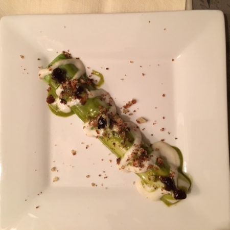 Snij het wit van de lenteui in en leg 2-3 minuten in koud water. Leg 3 cannelloni op het bord.