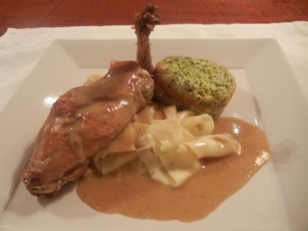 Leg een konijnbout op de tagliatelle, met de poot omhoog en schenk