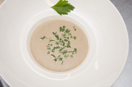 Houd de soep tegen de kook en voeg de Liason (eidooier/room) al roerend toe.