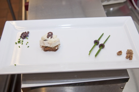 Op een bordje: 2 sprietjes bieslook door een olijvenring steken, daarnaast de croutons met daarop nog wat olijven-strooisel en bieslook strooisel.