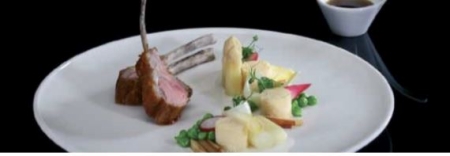 Snijd de gekookte asperges in 4 gelijke delen. Dresseer het bord als volgt om en om: 5 batonettes, een flannetje, 2 gekookte delen asperges, 2 batonettes, een flannetje, 5 batonettes, een flannetje, 2 aspergekopjes rechtopstaand. Drapeer de doperwten op twee plaatsen tegen het gerecht. Leg twee mooie stukjes radijs op het gerecht voor de bite. Versier deze ingrediënten met drie mooie delen van de Affilla Cress. Verdeel de lamsrug in koteletjes en plaats twee delen kruislings op ieder bord.